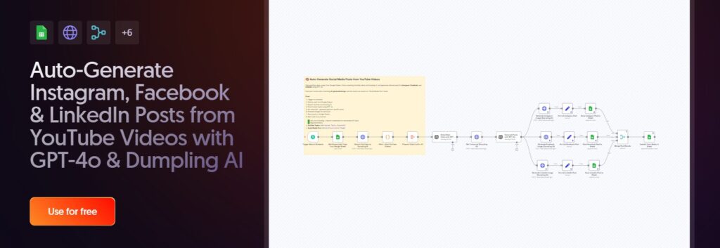 This template helps you transform your YouTube videos into ready-to-publish posts for Instagram, Facebook & LinkedIn. It uses GPT-4o with Dumpling AI to extract content, draft captions, and schedule your posts automatically.