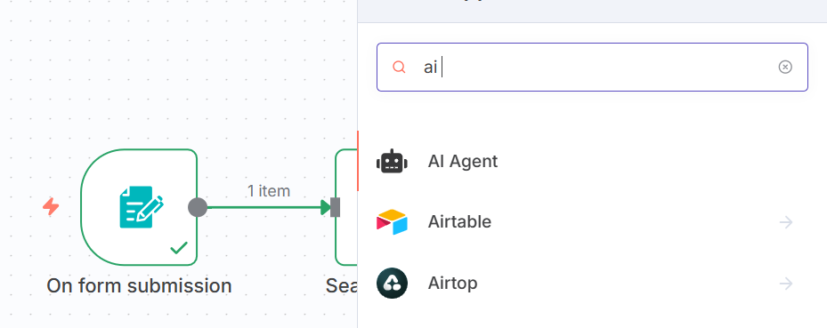 - Click the “+” connector from the Form Trigger node.