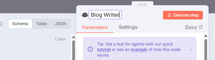 - Drag a Google Docs node, Notion node, or Email node to the right of the AI agent (blog writing) node.