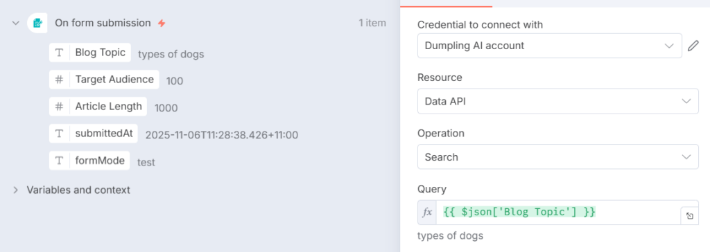 - Topic: {{ $(‘Blog Form Submission’).item.json[‘Blog Topic’] }}
