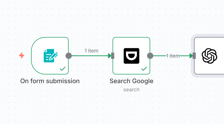 - Execute the Form Trigger and Dumpling AI Research nodes, so the Writing node can access research outputs.
