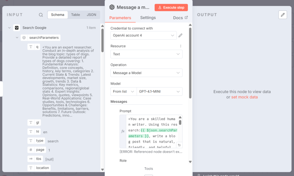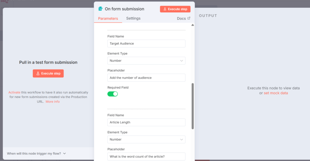 - Execute the Form Trigger node once so that Blog Topic appears as an input in the left panel.