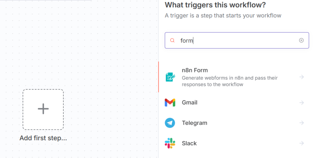 - Add a “Webhook” node or Form Trigger node from the left panel.
