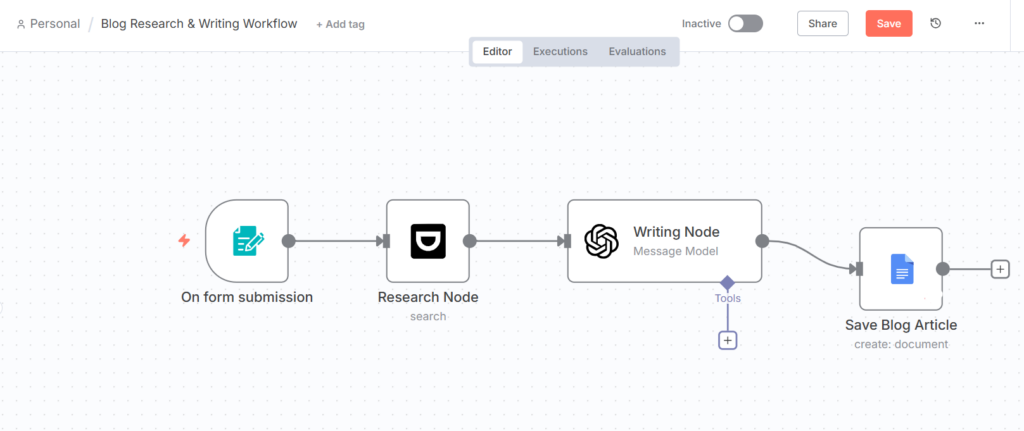 Here’s a breakdown of how the Blog Research and Writer n8n Workflow runs step-by-step: