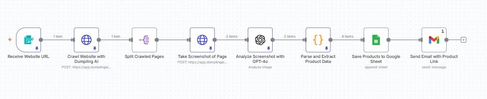 Finally, the Send Email with Product Link node delivers an email notification with a link to the Google Sheet.
