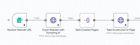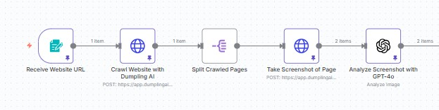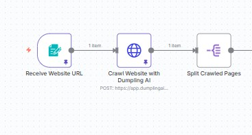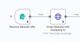 The Crawl Website with Dumpling AI node scans the provided URL and retrieves the content of up to 2 pages for analysis.