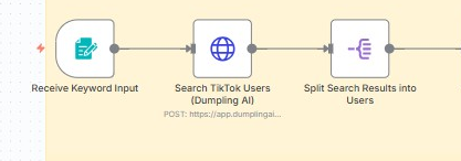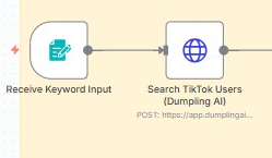 The HTTP Request Node calls Dumpling AI’s TikTok user search API using the keyword.