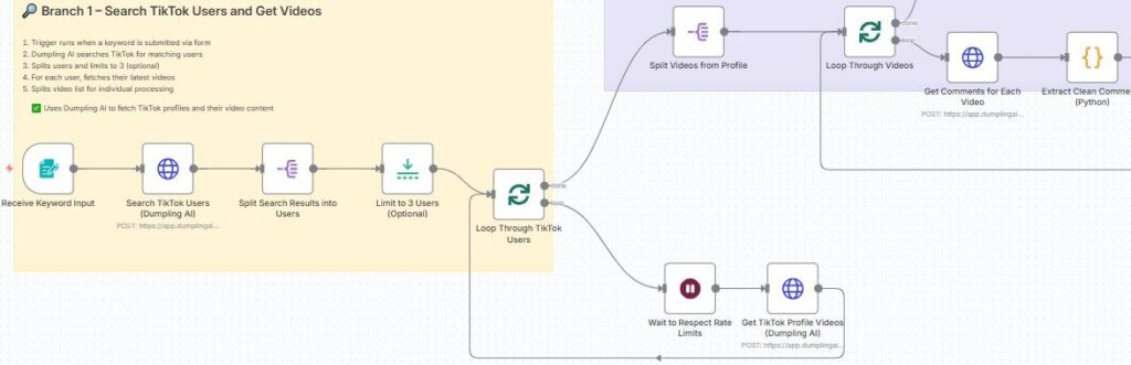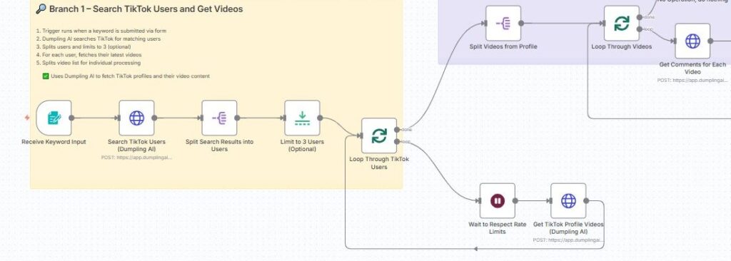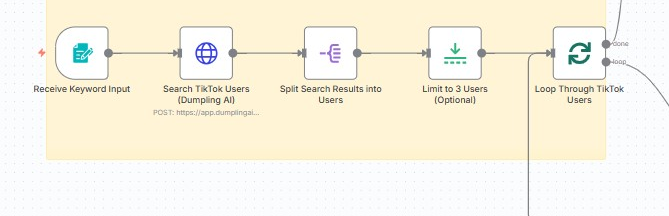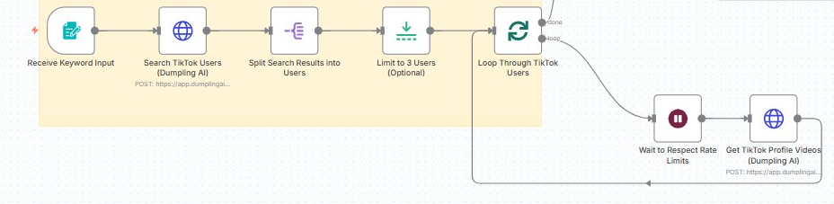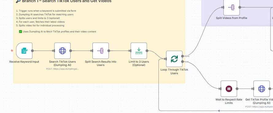 The workflow starts with a Form Trigger. When someone enters a keyword, this triggers the entire automation. For example, if you type “skincare,” it will search TikTok for relevant profiles and videos.