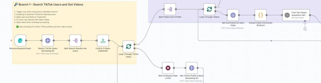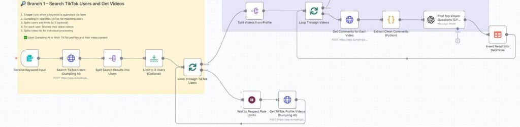 This workflow automatically finds frequently asked questions from TikTok video comments based on keywords you provide. It uses Dumpling AI to search TikTok users and their videos, then applies GPT-4 to analyze the comments and extract top recurring viewer questions.