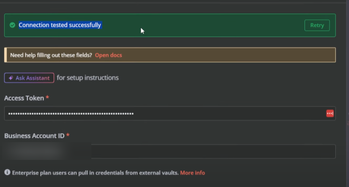 - Create new credentials using the Access Token and Business Account ID.