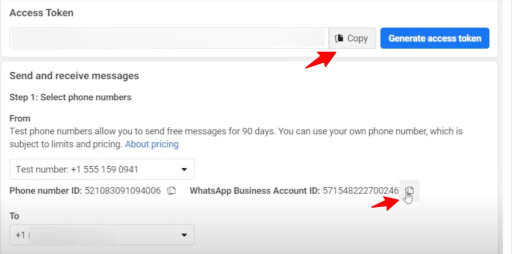 Copy and paste the access token and business account ID into the node fields