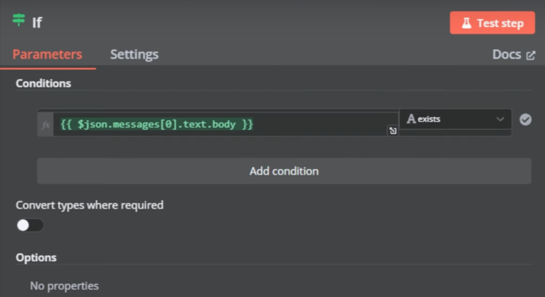 - Add an “If” node after the WhatsApp trigger.