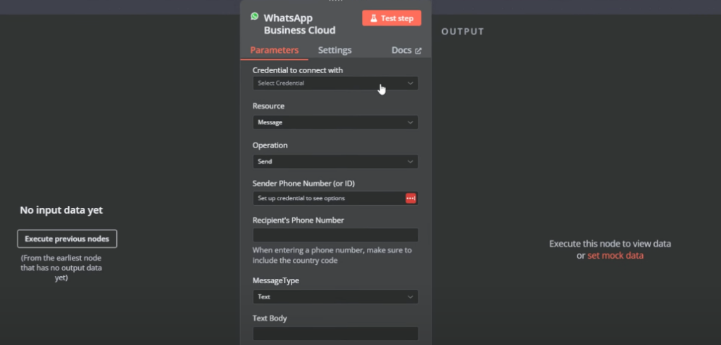 - Fill in the parameters of the WhatsApp business cloud node