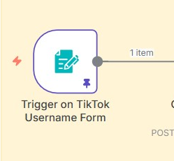 The process begins with a Form Trigger Node where you input a TikTok username. Once submitted, this triggers the entire automation flow.