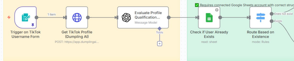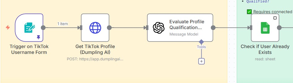This workflow streamlines the TikTok influencer qualification process from start to finish. Instead of manually checking each profile and updating spreadsheets, you can now: