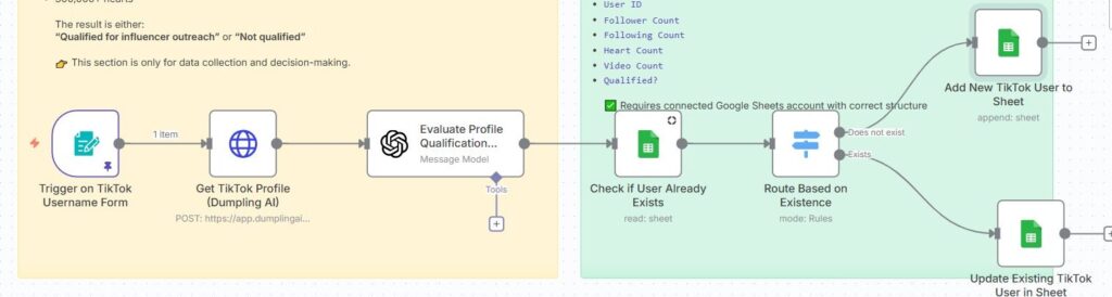 This automation qualifies TikTok users as potential influencers based on their content volume, follower count, and total likes (hearts). By simply entering a username, the workflow uses Dumpling AI to fetch profile data, applies GPT-4 to evaluate influencer criteria, and then updates or inserts the results into a Google Sheet.